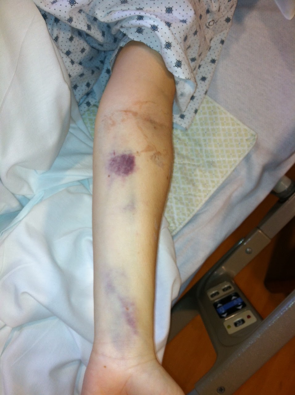 I warned her how tricky my veins were but she thought she could do it. Her first few attempts were not successful and she ended up blowing one of my veins. I didn't think anything of it at the time, but I bled A LOT from where she had attempted to insert the IV. There was blood all over the sheets. I'm not usually much of a bleeder, but I was in a lot of pain so I didn't give it much attention.