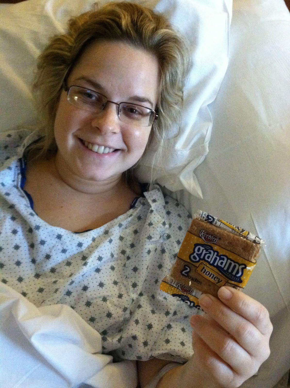 After about 36 hours on the magnesium drip (and strict bed rest), they took me off and let me have liquids again. I was very excited about this. I had never been so excited about nasty green jello in my life. The orange Popsicle was like a dream! When they finally let me have solid food again, the first thing they brought me was Graham crackers. I thought this was quite ironic.